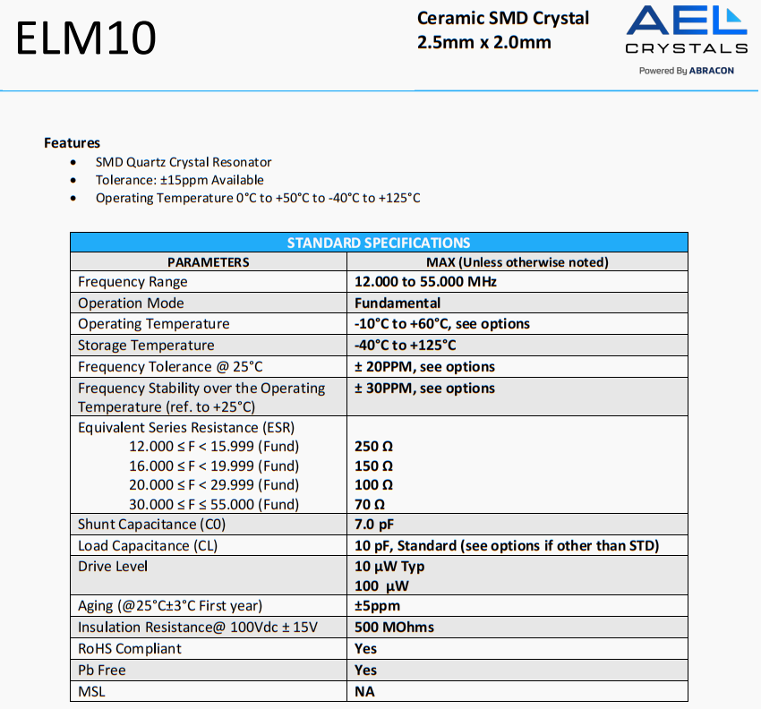 | ELM10-24.000MHz-16-R100-X-N15-T | AEL Crystals | ELM10 | 24 MHz | ±15ppm | ±10ppm | 16 pF |