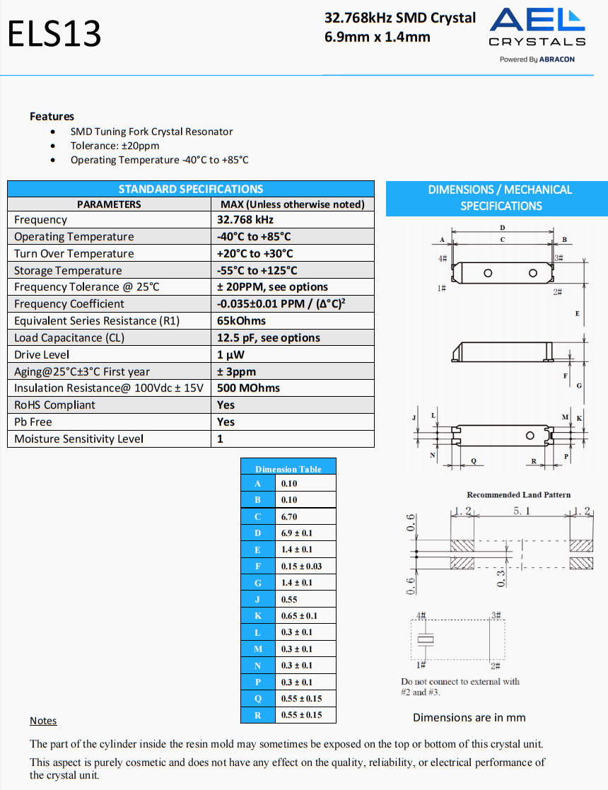 | ELS07-32.768kHz-T | AEL Crystals | ELS07 | 32.768 kHz | 0 | ±20ppm | 12.5 pF |