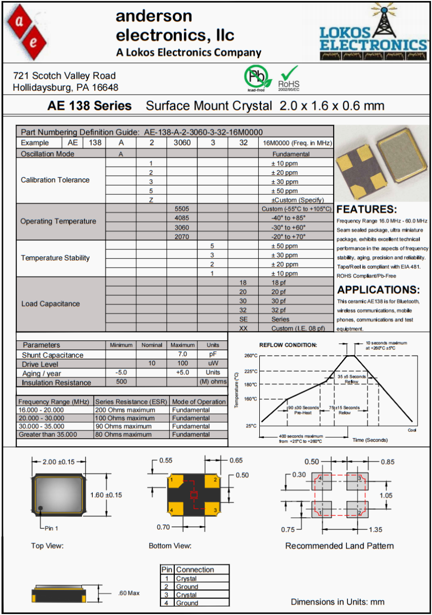 Anderson汽車輔助駕駛晶振,AE138高精度晶振,AE-138-A-2-4085-3-10-40M0000美國晶振,美國Anderson晶振公司,安德森晶振,進(jìn)口晶振,AE-138晶振,無源晶振,石英晶振,貼片晶振,超小型晶振,2016晶振,無源晶振,貼片晶振,無人機(jī)晶振,汽車輔助駕駛晶振,歐美進(jìn)口晶振,低損耗晶振,高品質(zhì)晶振。該陶瓷AE138適用于藍(lán)牙,無線通信,移動電話,通信和測試設(shè)備等其他IT產(chǎn)品的晶振應(yīng)用,三態(tài)功能,PC和LCDM等高端數(shù)碼領(lǐng)域,符合RoHS/無鉛。頻率范圍16.0 MHz - 60.0 MHz Seam密封封裝,超小型封裝,在頻率穩(wěn)定性、老化性、精度和可靠性方面具有優(yōu)異的技術(shù)性能。磁帶/卷軸符合EIA 481標(biāo)準(zhǔn)。