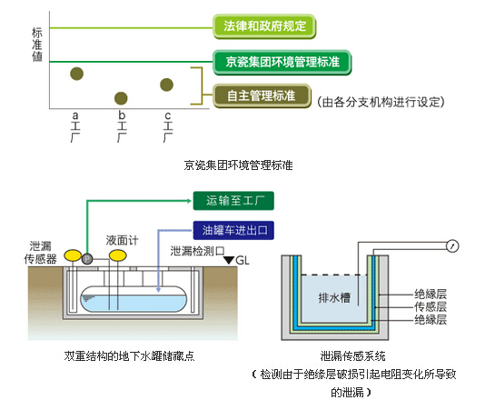 1992年,針對排氣、排水、土壤、地下水等,京瓷集團制定了比法律和政府規定還要嚴格的《京瓷集團環境管理標準》.而且,以該環境管理標準為基礎,在各網點設定了更為嚴格的自主管理標準,定期實施環境測量,貫徹環境管理.此外,出于防止土壤污染的考慮,制定了《土壤、地下水管理規程》,通過采用雙重結構的地下罐儲藏點、引進泄漏檢測系統等,致力于及時發現泄漏、防止污染擴大.
