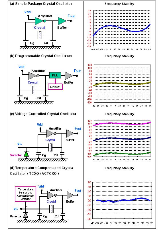 在(圖中)提供了數種石英振蕩器輸出頻率對溫度變化的穩定性示義圖