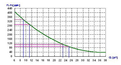 在圖中, CL=24 pF 時的頻率敏感度是10 ppm/pF, 及CL=10 pF時的頻率敏感度是20 ppm/pF. 在并聯線路中, 負載電容越小, 頻率對負載電容變化的敏感度越高. 相反的, 負載電容越大, 頻率對負載電容變化的敏感度越低. 這就是石英晶體共振子用于VCXO線路上時, 線路設計上會選用較小負載電容. 反之, 在要求較準確的頻率信號時, 線路設計上會選用較高的負載電容.