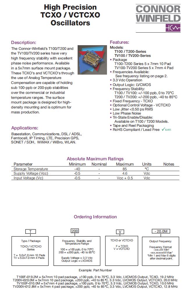 T200V-020.0M|VC-TCXO晶振|6G基站晶振,ConnorWinfield晶振,T200V有源晶振,T200V-020.0M晶振,VC-TCXO晶振,石英晶體振蕩器,7050mm晶振,頻率20MHz,電壓3.3V,工作溫度0~70°C,頻率穩定性100ppb,低相噪晶振,高可靠性晶振,6G基站晶振,通信設備晶振,DSL / ADSL晶振,精密GPS晶振,無線網絡晶振,SONET/SDH設備晶振.