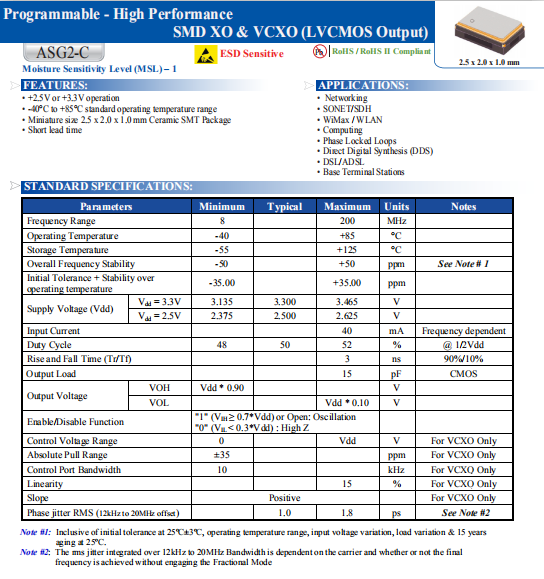 ABRACON晶振,ASG2-C晶振,壓控晶振.2520mm體積的晶振,可以說(shuō)是目前小型數(shù)碼產(chǎn)品的福音,目前超小型的智能手機(jī)里面所應(yīng)用的就是小型的石英晶振,該產(chǎn)品最適用于無(wú)線通訊系統(tǒng),無(wú)線局域網(wǎng),已實(shí)現(xiàn)低相位噪聲,低電壓,低消費(fèi)電流和高穩(wěn)定度,超小型,質(zhì)量輕等產(chǎn)品特點(diǎn),產(chǎn)品本身編帶包裝方式,可對(duì)應(yīng)自動(dòng)高速貼片機(jī)應(yīng)用,以及高溫回流焊接(產(chǎn)品無(wú)鉛對(duì)應(yīng)),為無(wú)鉛產(chǎn)品.