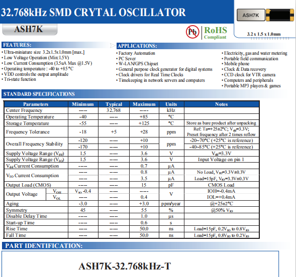ABRACON晶振,ASH7K晶振,有源晶體振蕩器.小型表面貼片晶振型,是標準的石英晶體振蕩器,適用于寬溫范圍的電子數(shù)碼產品,家電電器及MP3,MP4,播放器,單片機等領域.可對應32.768KHZ以上的頻率,在電子數(shù)碼產品,以及家電相關電器領域里面發(fā)揮優(yōu)良的電氣特性,滿足無鉛焊接的回流溫度曲線要求.