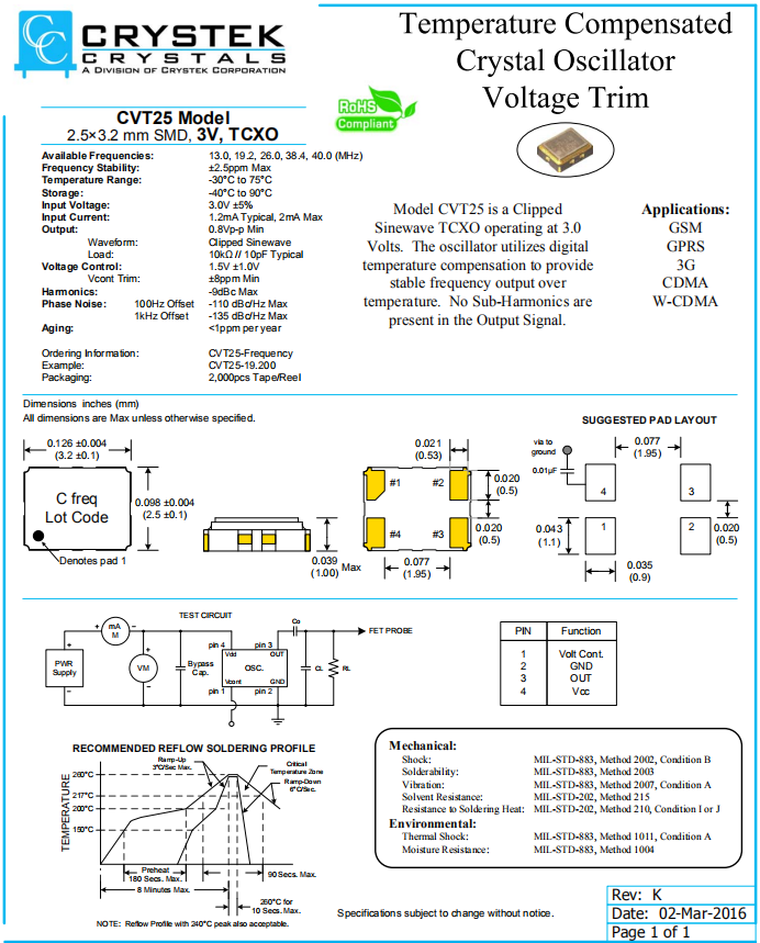CRYSTEK晶振,CVT25晶振,溫補(bǔ)晶體振蕩器.小型SMD有源晶振,從最初超大體積到現(xiàn)在的7050mm,6035mm,5032mm,3225mm,2520mm體積,有著翻天覆地的改變,體積的變小也試產(chǎn)品帶來了更高的穩(wěn)定性能,接縫密封石英晶體振蕩器,精度高,覆蓋頻率范圍寬的特點(diǎn),SMD高速自動(dòng)安裝和高溫回流焊設(shè)計(jì),Optionable待機(jī)輸出三態(tài)輸出功能,電源電壓范圍:1.8V?5V,高穩(wěn)定性,低抖動(dòng),低功耗,主要應(yīng)用領(lǐng)域:無線通訊,高端智能手機(jī),平板筆記本W(wǎng)LAN,藍(lán)牙,數(shù)碼相機(jī),DSL和其他IT產(chǎn)品的晶振應(yīng)用,三態(tài)功能,PC和LCDM等高端數(shù)碼領(lǐng)域,符合RoHS/無鉛.