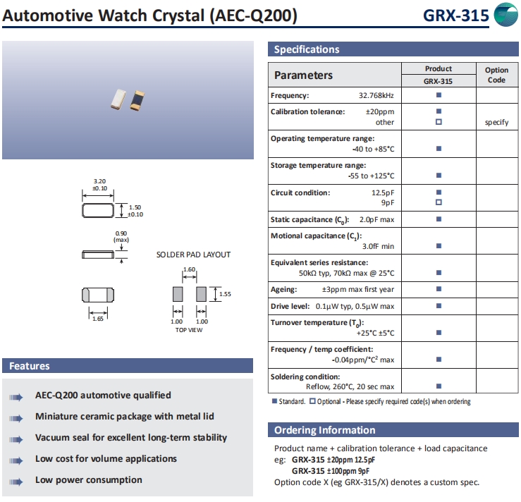 Golledge晶振,GRX-315晶振,音叉石英晶體.普通石英晶振,小體積SMD時鐘晶體諧振器,是貼片音叉晶體,千赫頻率元件,應用于時鐘模塊,智能手機,全球定位系統,因產品本身體積小,SMD編帶型,可應用于高性能自動貼片焊接,被廣泛應用到各種小巧的便攜式消費電子數碼時間產品,環保性能符合ROHS/無鉛標準.
