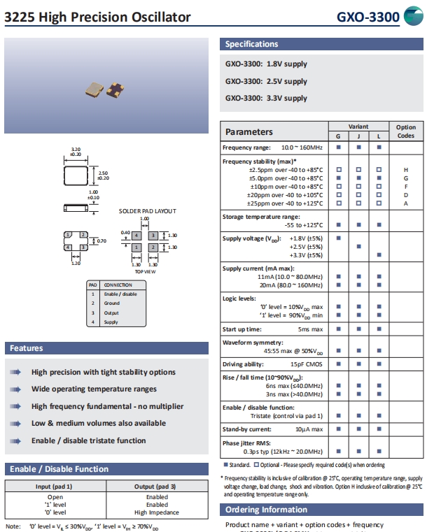 Golledge晶振,GXO-3300晶振,CMOS振蕩器.3225mm體積貼片晶振適用于消費電子領域的表面貼片型石英晶振,本產品已被確定的高信賴性適合用于汽車電子部件,晶體在嚴酷的環境條件下也能發揮穩定的起振特性,晶振本身具有耐熱,耐振,耐沖擊等優良的耐環境特性,滿足無鉛焊接的高溫回流溫度曲線要求,符合AEC-Q200認證.