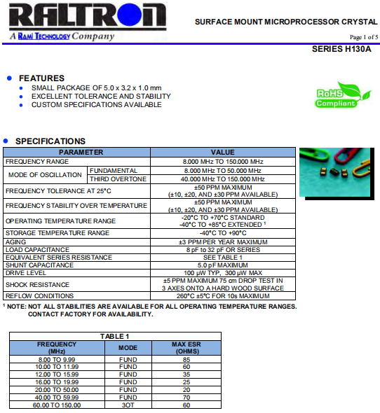 Raltron晶振,H130A晶振,石英晶體諧振器.小型石英貼片5032晶振,外觀尺寸具有薄型表面貼片型石英晶體諧振器,特別適用于有小型化要求的市場(chǎng)領(lǐng)域,比如智能手機(jī),無(wú)線藍(lán)牙,平板電腦等電子數(shù)碼產(chǎn)品.晶振本身超小型,薄型,重量輕,晶體具有優(yōu)良的耐環(huán)境特性,如耐熱性,耐沖擊性,在辦公自動(dòng)化,家電相關(guān)電器領(lǐng)域及Bluetooth,WirelessLAN等短距離無(wú)線通信領(lǐng)域可發(fā)揮優(yōu)良的電氣特性,滿足無(wú)鉛焊接的回流溫度曲線要求.