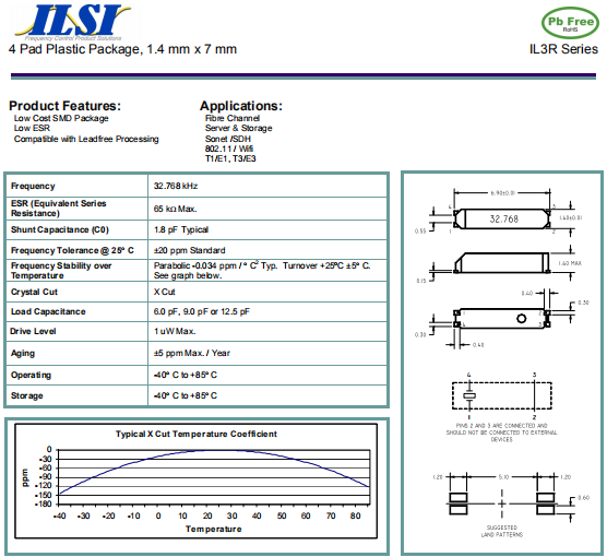 ILSI晶振,IL3R晶振,7015石英晶體諧振器.32.768K時鐘晶體具有小型,薄型,輕型的貼片晶振表面音叉型晶體諧振器,產(chǎn)品具有優(yōu)良的耐熱性,耐環(huán)境特性,可發(fā)揮晶振優(yōu)良的電氣特性,符合RoHS規(guī)定,滿足無鉛焊接的高溫回流溫度曲線要求,金屬外殼的封裝使得產(chǎn)品在封裝時能發(fā)揮比陶瓷諧振器外殼更好的耐沖擊性.