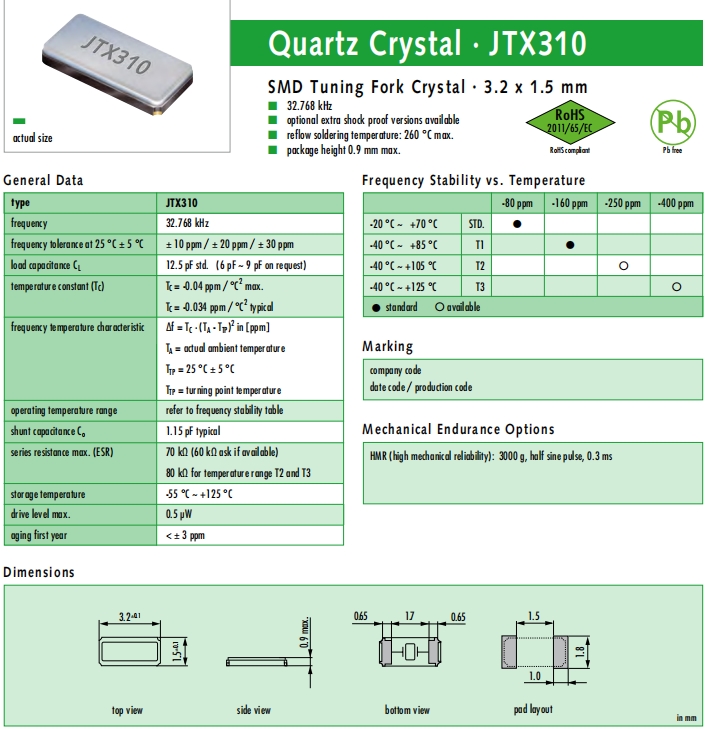 JAUCH晶振,JTX310晶振,壓電石英晶體.貼片表晶32.768K系列具有超小型,薄型,質地輕的表面貼片音叉型石英晶體諧振器,晶振產品本身具備優良的耐熱性,耐環境特性,在辦公自動化,家電領域,移動通信領域可發揮優良的電氣特性,符合無鉛標準,滿足無鉛焊接的回流溫度曲線要求,金屬外殼的石英晶振使得產品在封裝時能發揮比陶瓷晶振外殼更好的耐沖擊性能.