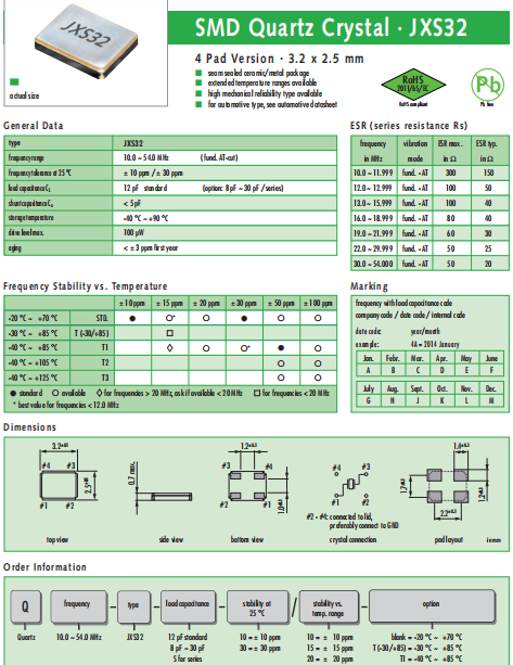 JAUCH晶振,JXS32晶振,高質量石英晶振.貼片石英晶振最適合用于車載電子領域的小型表面貼片石英晶體諧振器.也可對應有高可靠性要求的引擎控制用CPU的時鐘部分簡稱為時鐘晶體振蕩器,在極端嚴酷的環境條件下也能發揮穩定的起振特性,產品本身具有耐熱,耐振,耐撞擊等優良的耐環境特性,滿足無鉛焊接的回流溫度曲線要求,符合AEC-Q200標準.