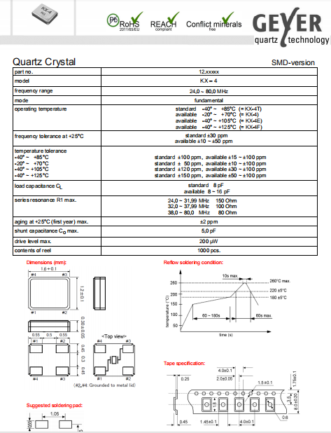 Geyer晶振,KX-4晶振,低功耗環保晶體.小型表面貼片晶振型,是標準的石英晶體諧振器,適用于寬溫范圍的電子數碼產品,家電電器及MP3,MP4,播放器,單片機等領域.可對應24.000MHz以上的頻率,在電子數碼產品,以及家電相關電器領域里面發揮優良的電氣特性,滿足無鉛焊接的回流溫度曲線要求.