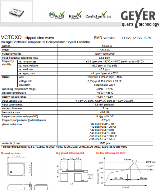 Geyer晶振,KXO-84晶振,壓控溫補晶振.有源晶振,是只晶體本身起振需要外部電壓供應,起振后可直接驅動CMOS 集成電路,產品本身已實現與薄型IC(TSSOP封裝,TVSOP封裝)同樣的1mm厚度,斷開時的消費電流是15 µA以下,編帶包裝方式可對應自動搭載及IR回流焊接(無鉛對應)產品有幾種電壓供選1.8V,2.5V,3V3.3V,5V,以應對不同IC產品需要.