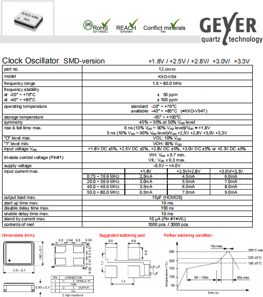 Geyer晶振,KXO-V94晶振,普通有源晶體振蕩器.貼片式石英晶體振蕩器,低電壓啟動功率,并且有多種電壓供選擇,比如有1.8V,2.5V,3.3V,3.8V,5V等,產(chǎn)品被廣泛應(yīng)用于,平板筆記本,GPS系統(tǒng),光纖通道,千兆以太網(wǎng),串行ATA,串行連接SCSI,PCI-Express的SDH / SONET發(fā)射基站等領(lǐng)域.符合RoHS/無鉛.