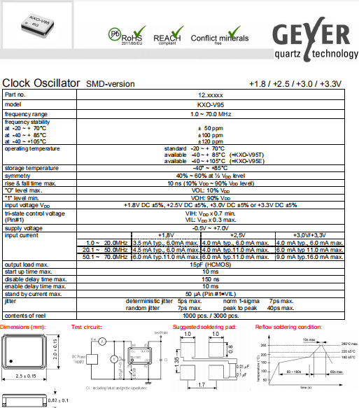 Geyer晶振,KXO-V95晶振,低功耗振蕩器.2520mm體積的晶振,可以說(shuō)是目前小型數(shù)碼產(chǎn)品的福音,目前超小型的智能手機(jī)里面所應(yīng)用的就是小型的石英晶振,該產(chǎn)品最適用于無(wú)線通訊系統(tǒng),無(wú)線局域網(wǎng),已實(shí)現(xiàn)低相位噪聲,低電壓,低消費(fèi)電流和高穩(wěn)定度,超小型,質(zhì)量輕等產(chǎn)品特點(diǎn),產(chǎn)品本身編帶包裝方式,可對(duì)應(yīng)自動(dòng)高速貼片機(jī)應(yīng)用,以及高溫回流焊接(產(chǎn)品無(wú)鉛對(duì)應(yīng)),為無(wú)鉛產(chǎn)品.