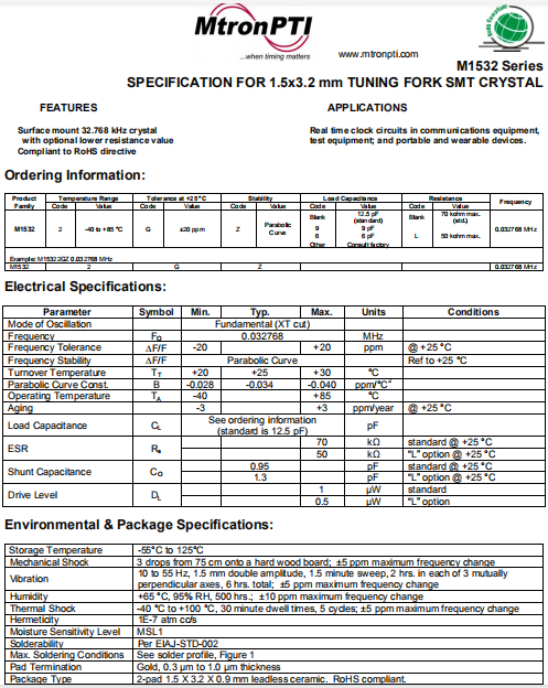 MTRONPTI晶振,M1532晶振,二腳貼片石英晶體.超小型,薄型,質地輕的表面貼片音叉型晶體諧振器,手機晶體,產品體積小,特別適用于各種小巧的便攜式消費電子數碼產品,在移動通信領域得到了廣泛的應用,晶振產品本身可發揮優良的電氣特性,滿足無鉛焊接的高溫回流溫度曲線要求.