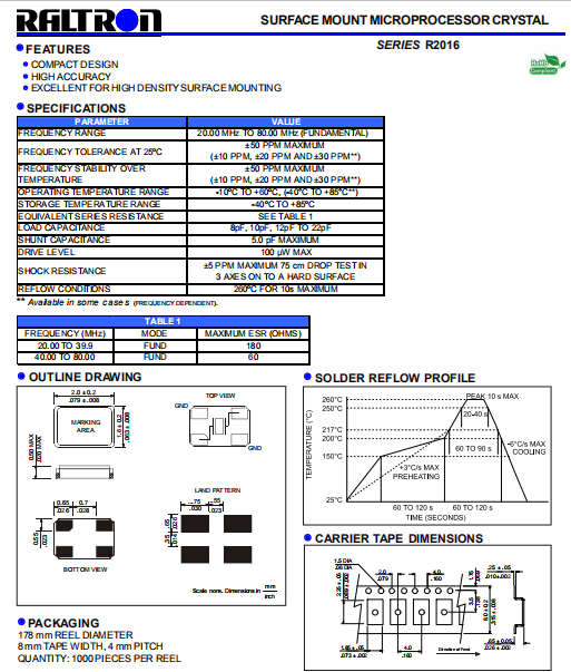 Raltron晶振,R2016晶振,石英晶體諧振器.貼片石英晶體,體積小,焊接可采用自動貼片系統(tǒng),產(chǎn)品本身小型,表面貼片晶振,特別適用于有小型化要求的電子數(shù)碼產(chǎn)品市場領域,因產(chǎn)品小型,薄型優(yōu)勢,耐環(huán)境特性,包括耐高溫,耐沖擊性等,在移動通信領域得到了廣泛的應用,晶振產(chǎn)品本身可發(fā)揮優(yōu)良的電氣特性,滿足無鉛焊接的高溫回流溫度曲線要求.