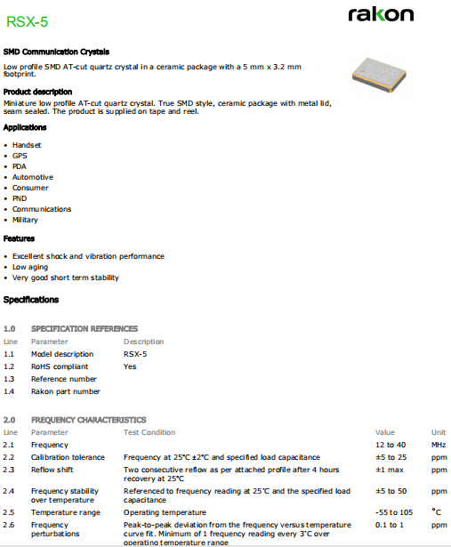 | Rakon晶振 | 單位 | RSX-5晶振 | 石英晶振基本條件 |