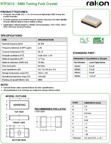Rakon晶振,RTF3215晶振,壓電石英晶體.32.768K時鐘晶體具有小型,薄型,輕型的貼片晶振表面音叉型晶體諧振器,產(chǎn)品具有優(yōu)良的耐熱性,耐環(huán)境特性,可發(fā)揮晶振優(yōu)良的電氣特性,符合RoHS規(guī)定,滿足無鉛焊接的高溫回流溫度曲線要求,金屬外殼的封裝使得產(chǎn)品在封裝時能發(fā)揮比陶瓷諧振器外殼更好的耐沖擊性.
