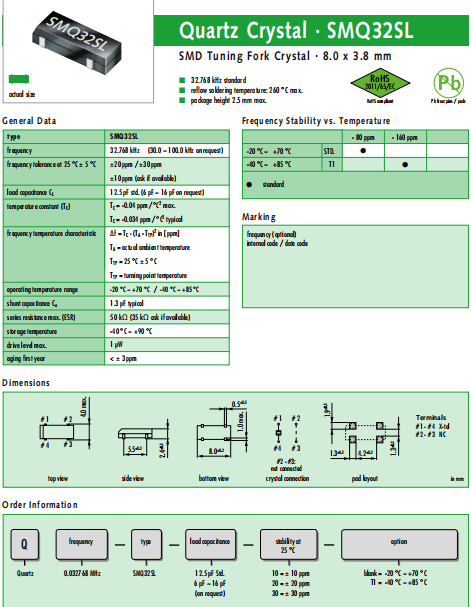 JAUCH晶振,SMQ32SL晶振,壓電石英晶體.超小型,薄型,質地輕的表面貼片音叉型晶體諧振器,手機晶體,產品體積小,特別適用于各種小巧的便攜式消費電子數碼產品,在移動通信領域得到了廣泛的應用,晶振產品本身可發揮優良的電氣特性,滿足無鉛焊接的高溫回流溫度曲線要求.