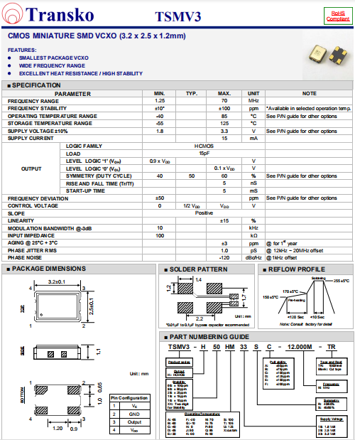 Transko晶振,TSMV3晶振,VCXO晶體振蕩器.普通石英晶振,外觀完全使用金屬材料封裝的,產品本身采用全自動石英檢測儀,以及跌落,漏氣等苛刻實驗.產品本身具有高穩定性,高可靠性的石英晶體振蕩器,焊接方面支持表面貼裝,外觀采用金屬封裝,具有充分的密封性能,晶振本身能確保其高可靠性,采用編帶包裝,可對應產品應用到自動貼片機告訴安裝,滿足無鉛焊接的高溫回流溫度曲線要求.