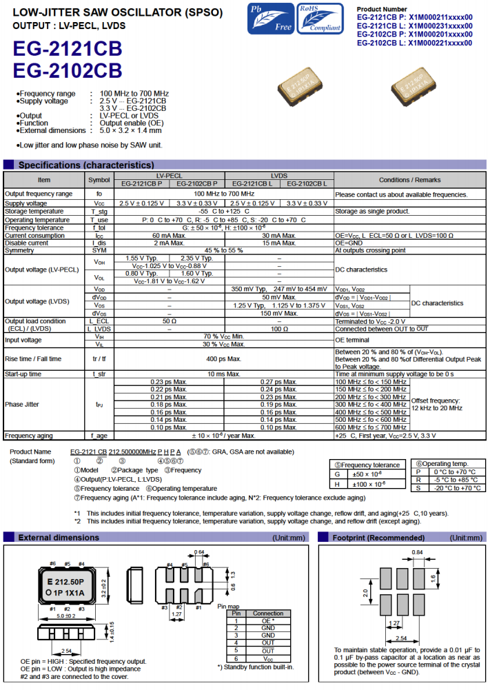 | X1M0002010007 | EG-2102CB | 625.000000 MHz | 5.00 x 3.20 x 1.40 mm | LV-PECL | 2.970 to 3.630 V |