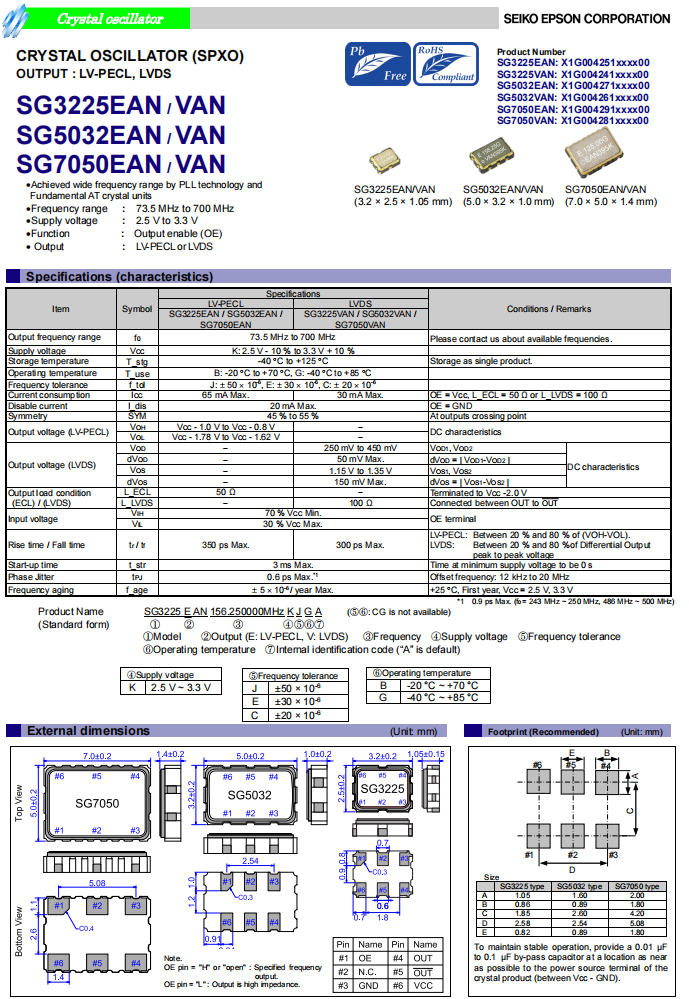 | X1G0042710052 | SG5032EAN | 156.250000 MHz | 5.00 x 3.20 x 1.20 mm | LV-PECL | 2.250 to 3.630 V | -20 to 70 °C |
