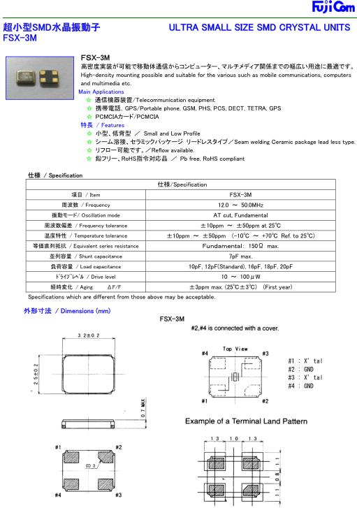 Fujicom晶振,FSX-3M四腳貼片晶振,SMD水晶振動子,超小型表面貼片型石英SMD晶振,最適合使用在汽車電子領域中,也是特別要求高可靠性的引擎控制用CPU的時鐘部分.低頻晶振可從7.98MHz起對應,小型,超薄型具備強防焊裂性,石英晶體在極端嚴酷的環境條件下也能發揮穩定的起振特性,產品本身具有耐熱,耐振,耐撞擊等優良的耐環境特性,滿足無鉛焊接以及高溫回流溫度曲線要求,符合AEC-Q200標準.