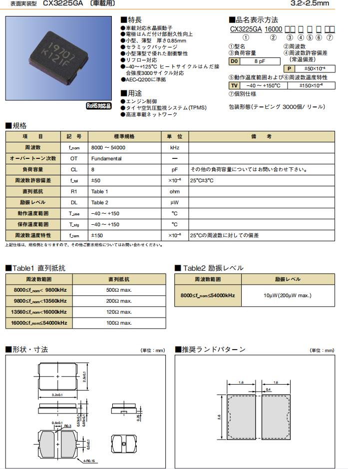 | CX3225GA16000D0PTVCC | Kyocera晶振 | CX3225GA, Kyocera | MHz Crystal | 16MHz | -40°C ~ 150°C |