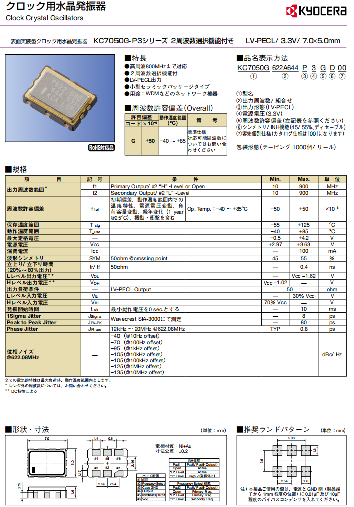 KC7050G622.080P3GD00|LV-PECL差分石英晶振|6G模塊晶振 參數表