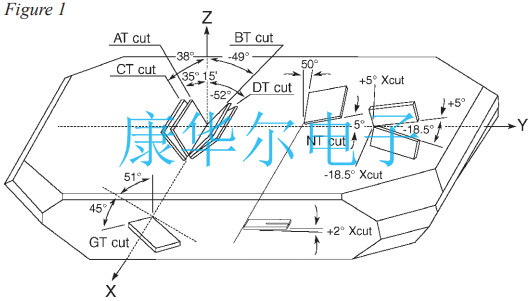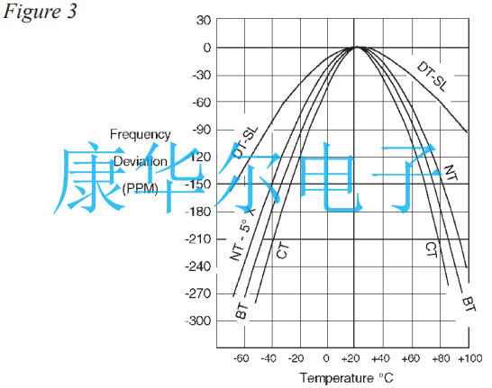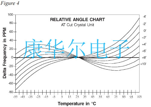 在各種元素中,貼片石英晶振的“AT”切割成了最受歡迎的,因為它是相對較高的頻率,表現(xiàn)出優(yōu)異的頻率與溫度穩(wěn)定性并且以合理的成本廣泛獲得.該“AT”切割的頻率與溫度能力晶體單元如圖4所示.