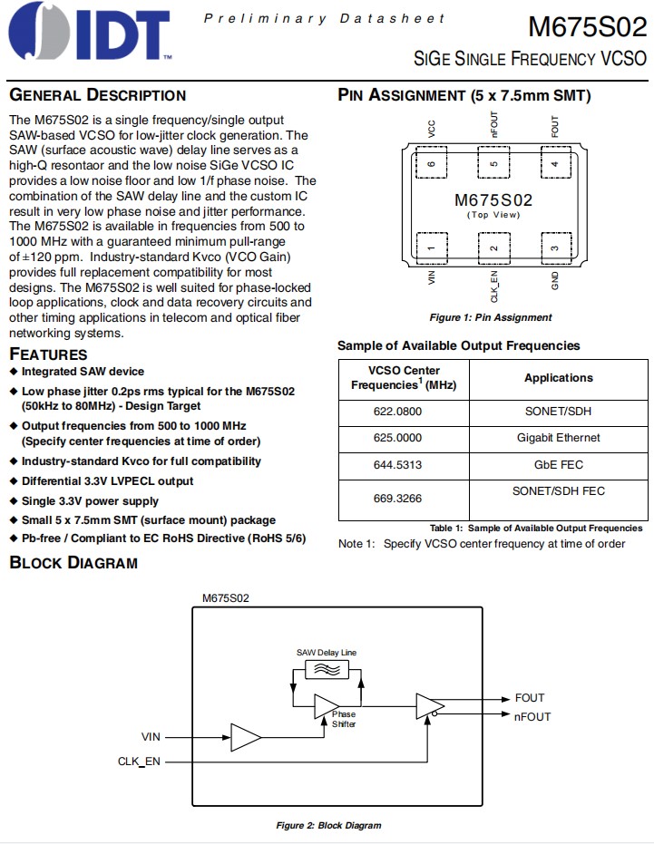 | M675S02-AAT | IDT晶振 | OSC VCSO 622.08MHZ LVPECL SMD | M675S02 |