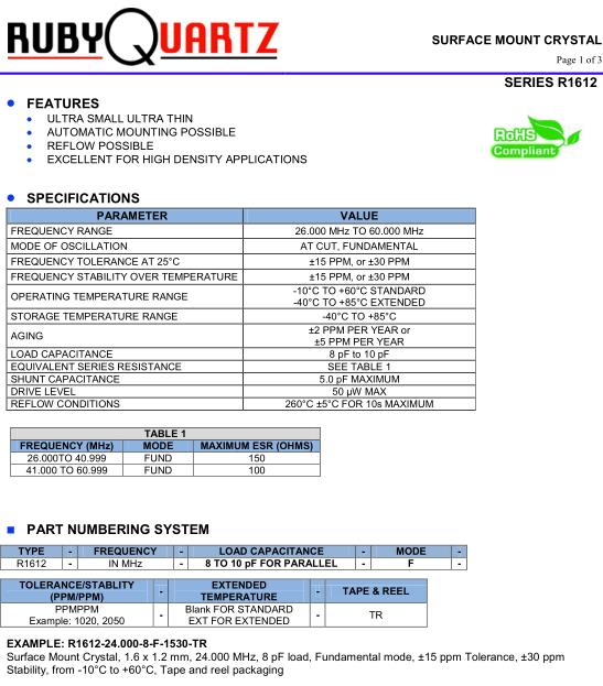 盧柏進口晶振,R1612四腳貼片晶體,R1612-24.000-8-F-1530-TR無源諧振器,貼片晶振本身體積小,超薄型石英晶體振蕩器,特別適用于有目前高速發展的高端電子數碼產品,因為晶振本身小型化需求的市場領域,小型,薄型是對應陶瓷振蕩器(偏差大)和普通的石英晶體振蕩器(偏差小)的中間領域的一種性價比較出色的產品.產品廣泛用于筆記本電腦,無線電話,衛星導航SSD,USB,Blu-ray等用途,符合無鉛焊接的高溫回流焊曲線特性.