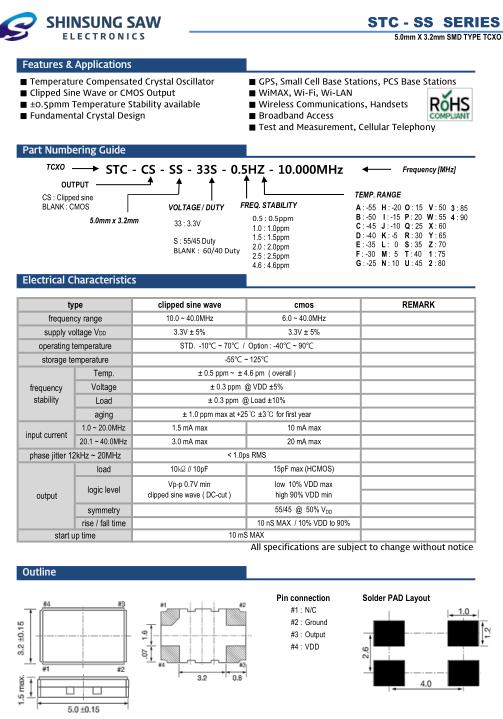 SHINSUNG晶振,STC-SS貼片晶體,STC-CS-SS-33S-0.5HZ-20.000MHz溫補振蕩器,5032mm體積的石英晶體振蕩器,有源晶振,該產品可驅動2.5V的溫補晶振,壓控晶振,VC-TCXO晶體振蕩器產品,電源電壓的低電耗型,編帶包裝方式,可對應自動高速貼片機自動焊接,及IR回流焊接(無鉛對應),為無鉛產品,超小型,質地輕.產品被廣泛應用到集成電路,程控交換系統,無線發射基站.