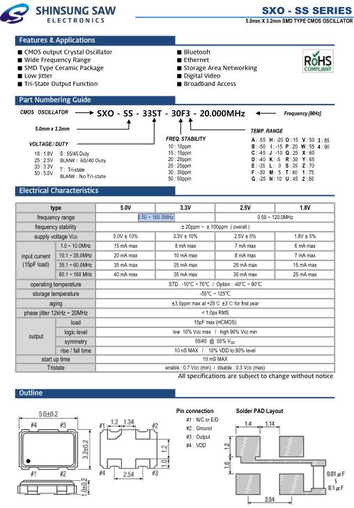 SHINSUNG低抖動晶振,SXO-SS通信設(shè)備晶振,SXO-SS-33ST-30F3-24.000MHz晶振,小型SMD有源晶振,從最初超大體積到現(xiàn)在的7050mm,6035mm,5032mm,3225mm,2520mm體積,有著翻天覆地的改變,體積的變小也使產(chǎn)品帶來了更高的穩(wěn)定性能,接縫密封石英晶體振蕩器,精度高,覆蓋頻率范圍寬的特點(diǎn),SMD高速自動安裝和高溫回流焊設(shè)計,Optionable待機(jī)輸出三態(tài)輸出功能,電源電壓范圍:1.8V~5V,高穩(wěn)定性,低抖動,低功耗,主要應(yīng)用領(lǐng)域:無線通訊,高端智能手機(jī),平板筆記本W(wǎng)LAN,藍(lán)牙,數(shù)碼相機(jī),DSL和其他IT產(chǎn)品的晶振應(yīng)用,三態(tài)功能,PC和LCDM等高端數(shù)碼領(lǐng)域,符合RoHS/無鉛.