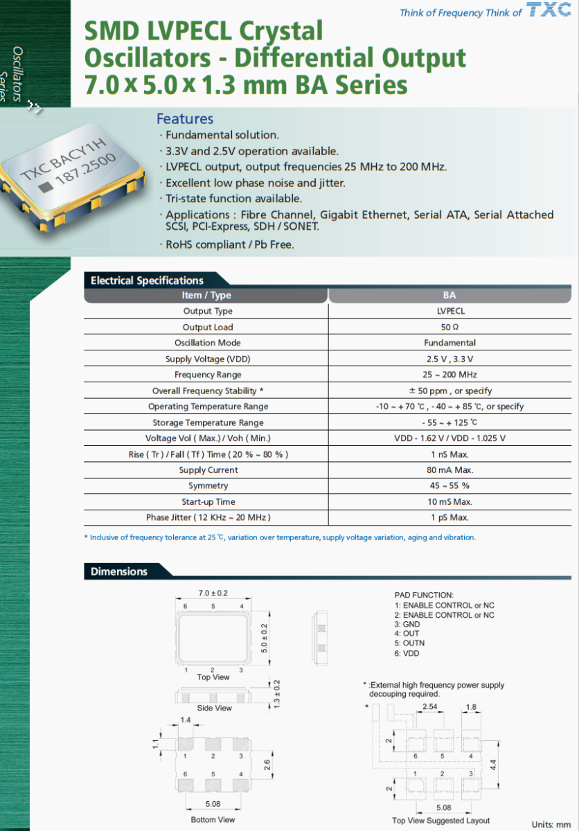| BA50070002 | TXC晶振 | BA | 50 MHz | LVPECL | 3.3V | ±50ppm |
