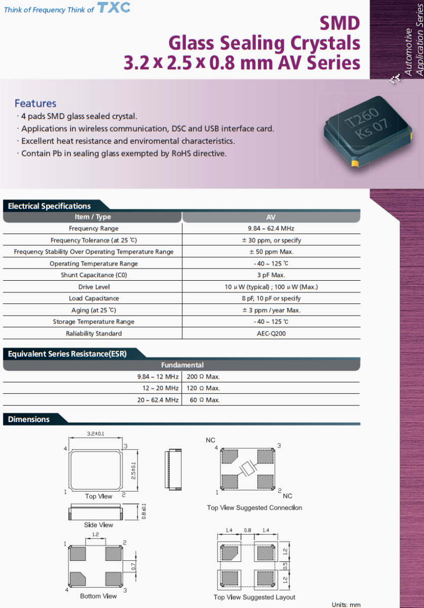 | AV-9.84375MAGE-T | TXC晶振 | AV | 9.84375MHz | ±50ppm | ±30ppm | 12pF |