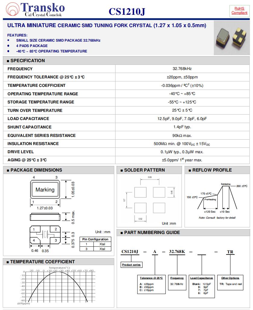 特蘭斯科晶振,CS1210J-C-32.768K-12.5-TR,6G路由器晶振參數表