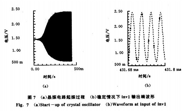 所有電路參數都設置好之后,使用Spectre進行電路仿真,可以得到晶振電路的起振過程及穩態下的波形.從圖7(a)中可以清楚的看到晶振電路的起振過程,一般的起振時間需要幾百個ms.穩定情況下invl的一端是正弦波,另一端是被放大了的近似方波,需要圖1中所示的inv2進行整型得到外形較好的方波并提供足夠的驅動能力驅動后面的數字電路.