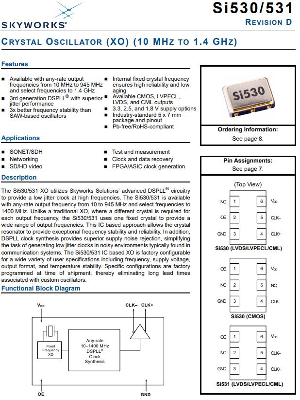 特性:可與任何速率輸出,頻率范圍為10mhz~945mhz,選擇頻率為1.4GHz,第三代DSPLL®,性能優(yōu)越抖動(dòng)性能,頻率穩(wěn)定性優(yōu)于SAW-based有源晶體振蕩器,內(nèi)部固定晶頻,保證了高可靠性和低功耗老化,具備CMOS, LVPECL,LVDS和CML輸出,3.3、2.5、1.8 V供電選項(xiàng),行業(yè)標(biāo)準(zhǔn)5 × 7mm封裝和引腳,Pb-free /通過無鉛認(rèn)證.