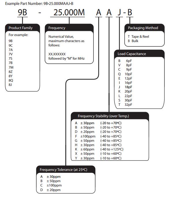 不管進口晶振還是國產晶振品牌,每個品牌產品系列都有相對應的料號,料號后面還有產品編碼。那很多時候晶振料號和編碼我們總是搞不清楚,到底怎么去區別,今天我們就來說說臺產晶振品牌,TXC晶振料號編碼如何分辨,現在我們先來看看:7A-16.000MAAE-B這顆無源晶振,這是一顆5032mm尺寸晶振,TXC晶振品牌的料號是7A,編碼是7A-16.000MAAE-那這個料號代表是什么呢?比如7A是TXC晶振料號,16.000M是代表頻率,A就代表額定頻率偏差是+-30ppm,當然也可能是B,如果是B的話就代表50ppm,C的話就代表100ppm,D的話就代表20ppm,按字母分辨,后面那個A就代表溫度精度的頻率偏差,30ppm,隨著溫度的變化,溫度的不一樣,參數也會跟著變化,比如K,那頻率穩定度就是+-60ppm,這個溫度參數就屬于汽車級晶振,工業級晶振產品了,后面在J的話就表示晶振負載電容,這個負載電容就是18pf,假如是K的話就代表TXC晶振的負載電容是20PF,按照字母以此類推,然后在最后面T或者B的話就代表包裝,編帶還是袋裝分類了。我解釋的這么清楚,小盆友們應該都對有源晶振了解了吧,如果還不了解就打TXC晶振技術部門電話0755-27838351資訊吧。