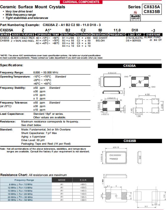 | CX635A-A5B2C3-40-18.432D13 | 卡迪納爾晶振 | CRYSTAL 18.4320MHZ 13PF SMD | CX635A | 18.432MHz | ±50ppm | 40 Ohm | -20°C ~ 70°C |