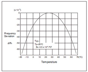 音叉晶體的頻率溫度特性的負二次曲線,其中有一個高峰期在25ºC每左圖所示。