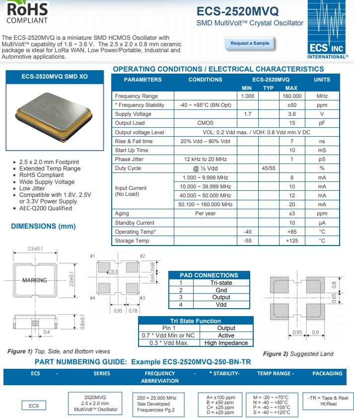 | ECS-2520S33-200-FN-TR | ECS Crystal | ECS-2520S | 20MHz | -40°C ~ 85°C |