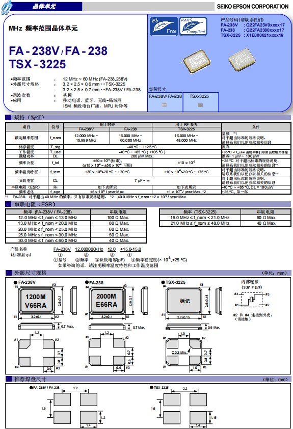 愛普生晶振FA-238是一款小體積尺寸3.2x2.5mm無源晶振,石英晶體諧振器,四腳貼片晶振,頻率范圍16MHz至60MHz,工作溫度-40℃至+85℃(+105℃),具有超小型,輕薄型,耐熱,耐振,耐沖擊等優(yōu)良的耐環(huán)境特性。特別適用于小型便捷式移動通訊,可穿戴設備,智能手機,平板電腦,便捷式電子儀器,汽車電子,智能家居等。