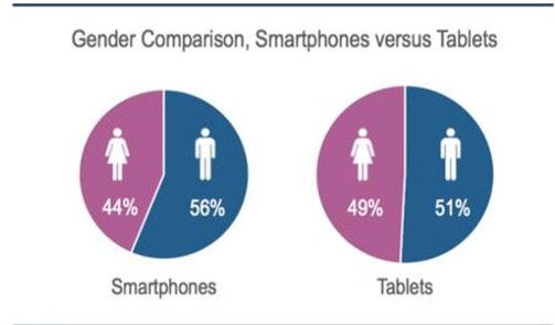 以上餅圖比較了智能手機和平板電腦用戶的性別分布。粉色代表女性,藍色代表男性。盡管在智能手機用戶中男性比例更高,但平板電腦用戶中男女比例基本平衡。根據傳統觀念,男性會比女性更多使用科技產品,但平板電腦用戶的情況顛覆了這一觀念。這表明,平板電腦從長期來看在大眾市場具有吸引力。