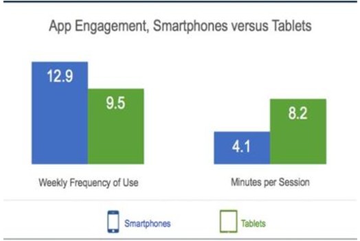 最后,我們比較了智能手機和平板電腦上的用戶參與度。平均來看,消費者會更頻繁地使用智能手機應用,但每次使用時間較短。而消費者會更多地使用平板電腦去消費媒體。由于平板電腦更多地在晚間時段使用,因此這一趨勢是合理的。相反地,消費者會在一天中的多個時段使用智能手機應用,完成諸如登錄社交網絡或使用工具等應用。