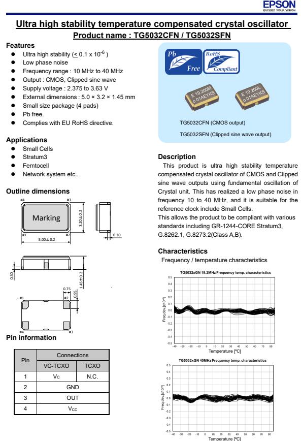 | X1G005401001100 | TG5032SFN | 40.000000 MHz | 5.00 x 3.20 x 1.45 mm | 3.135 to 3.465 V | +/-1.0 ppm | -40 to ++85 °C | +/-0.28 ppm |