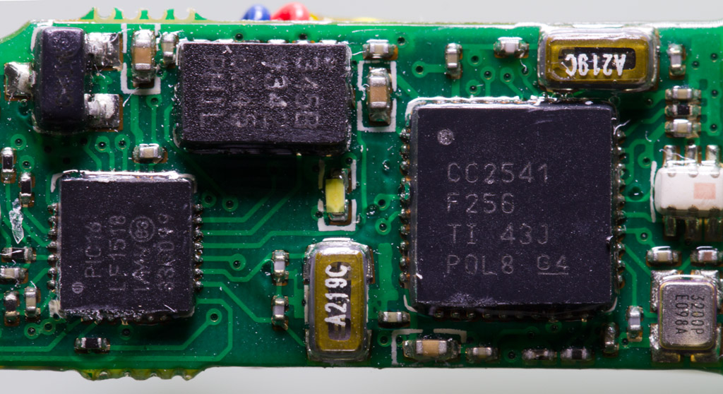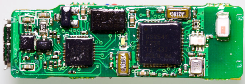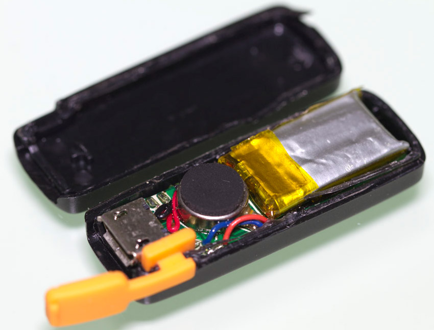 現(xiàn)在就來拆拆手環(huán)主機(jī)了,由于手環(huán)外殼采用熱熔接方式,要拆開手環(huán)只能采用暴力方式拆解.揭開外殼,可以看到智能手環(huán)主機(jī)電路板和零件,從MicroUSB膠塞固定位置上可以看到膠塞頭并沒有完全密封起來,如果游泳時(shí)帶著這個(gè)手環(huán)進(jìn)入水中可能會(huì)導(dǎo)致進(jìn)水.